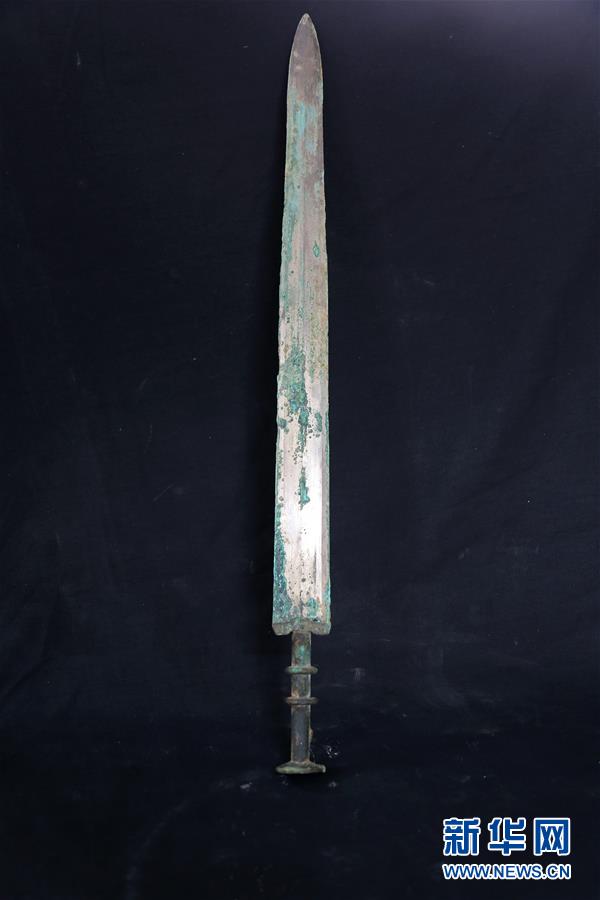此外,记者还注意到这批墓葬出土的一柄保存完整的铜剑。通长60厘米的铜剑剑身是中部起脊的八面体造型,近锋端有明显束腰,仔细观察可以发现使用之后在刃部留下的豁口。铜剑的束腰和八面体剑身使其具有较强杀伤力。据《史记》记载,为了适应战争需要,秦国自简公六年开始“令吏初带?!?,次年令“百姓初带剑”。从此秦国男子带剑成为规制。张杨力铮说,这柄剑的造型是吴越风格,从刃部豁口推测,是经历血雨腥风的实用武器,也印证了秦人的尚武之风和与其他地区的文化交流。