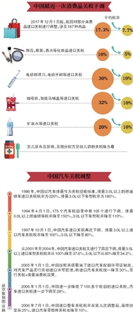 中国最近的一次大幅度下调关税,发生在2017年底。财政部和海关总署联合宣布,2017年12月1日起,187项商品的进口关税将进一步调低,其中家长们最关心的婴儿尿布及配方婴幼儿奶粉进口关税甚至降为零,曾一度引发海淘热潮的智能马桶盖的进口关税也从32%降至10%,平均税率由17.3%降至7.7%。有声音称这是近年力度最大的一次降税。