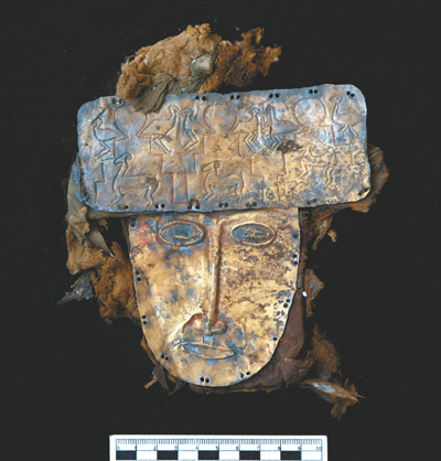 这件面具14厘米见方,薄如纸片,大小与真人面部相仿,由冠部和面部两部分连缀而成。冠部呈长方形,錾刻出三座并列的塔形祭坛,顶部有圆形穹顶,与早期佛教时期的窣堵坡非常相似。每个祭坛两侧各刻一只立鹤,祭坛前方各刻一只羊。面部有一部分重叠在冠部之下,重叠部分有两排小孔,用丝线将两部分连缀在一起。面部刻出精细的五官,圆目修鼻,甚至表现出人中和法令纹,五官和刻痕都用红色颜料勾勒,显得颇有生气。面具周缘有一周小圆孔,两个一组,背后衬有多层丝织物,残留有打结的系带。丝织物后面又用薄木片加固,通过系带与丝织物缝制在一起。