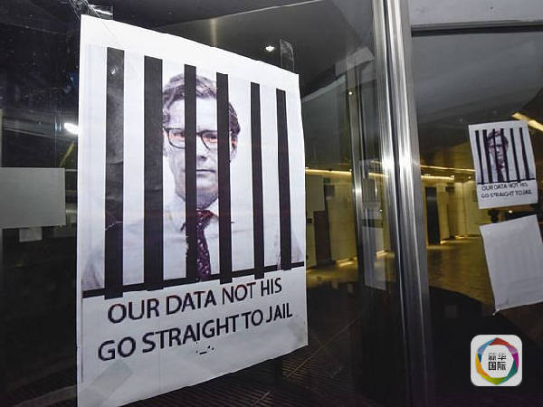 3月20日,一张抗议标语张贴在剑桥分析公司办公室玻璃上,标语上写着:“我们的数据不是他的,直接关入大牢?!保ㄐ禄绶ⅲ?/p>