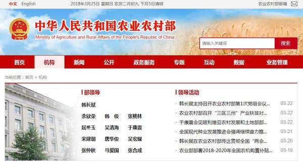 “农业农村部”网站更名上线 新组建领导班子公布