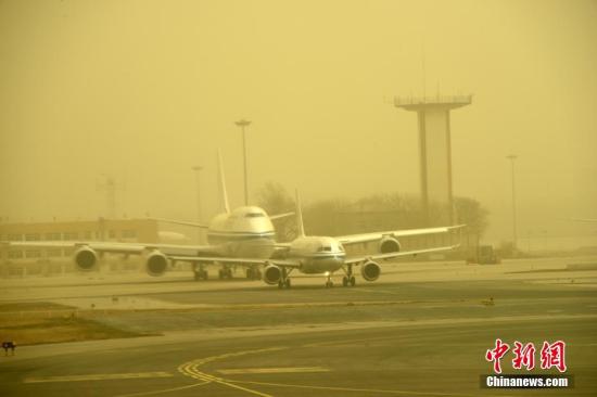 3月28日,北京首都国际机场沙尘天气笼罩,出港航班飞机在跑道上等待起飞。 中新社记者 孙自法 摄
