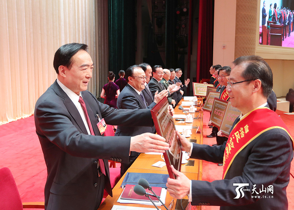 陈全国、雪克来提·扎克尔等领导为受表彰的先进工作队、先进工作者和优秀组织单位代表颁奖。