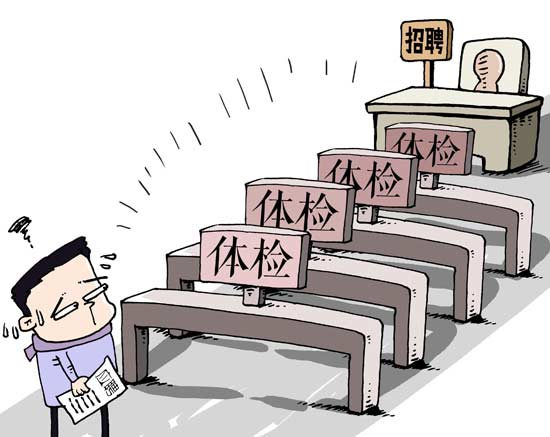 去年毕业的王晶在求职过程中也进行了3次体检,她的一个同学在求职时体检了4次。王晶认为重复体检的情况很普遍。“我这3次体检都是要去公司指定的体检中心进行。最让我费解的是,我参加了一个集团的两个子公司的招聘,但是两个公司相互之间不承认体检结果”。