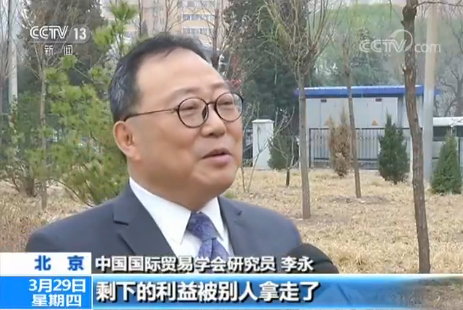 国际贸易学会中美欧战略经济研究中心共同主席李永:苹果(手机)出口到美国的时候,(每个手机)以制造成本报的话它是270多美元,它的零售价是600多美元,实际上中国只是在这里面得到了大概是6.5美元左右。剩下的呢,利益被别人拿走了。
