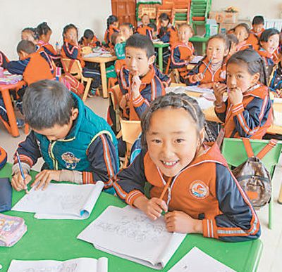 那曲地区扎仁镇小学的孩子们在窗明几净的教室里上课。格桑吉美摄