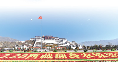 3月28日上午,拉萨布达拉宫广场鼓乐齐鸣,歌声嘹亮,来自西藏各地的3000多名群众,以升国旗、唱国歌的方式,欢庆百万农奴解放59周年。