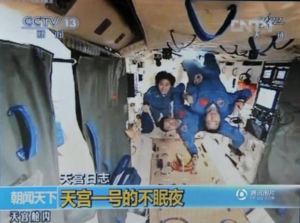 2012年6月28日,三名航天员在天宫一号摆造型拍摄"全家福"。
