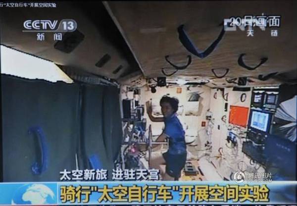 2012年6月20日,航天员刘洋骑行"太空自行车"开展空间实验。
