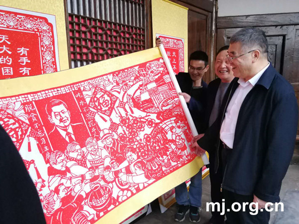 朱永新在将军村调研时,欣赏由乡贤陈冶先创作的剪纸作品。