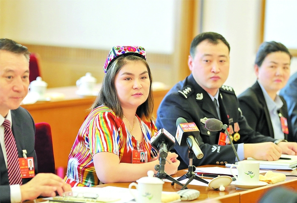 3月6日,出席十三届全国人大一次会议的新疆代表团分组审议政府工作报告。全国人大代表、于田县兰干乡民政社会保障事务所干部如克亚木·麦提赛地(左)围绕健全社会救助体系等发言?!醣颈钦叽拗炯嵘?/p>