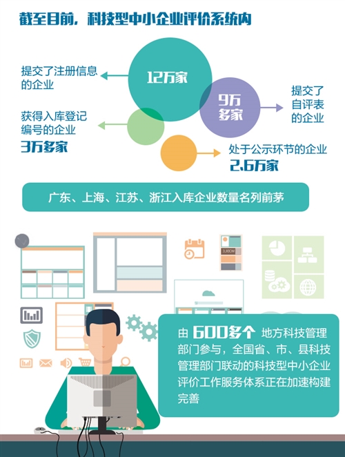 截至目前,科技型中小企业评价系统内共有12万家企业提交了注册信息,9万多家企业提交了自评表,3万多家企业获得入库登记编号,2.6万家企业处于公示环节中。广东、上海、江苏、浙江入库企业数量名列前茅。