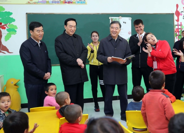 4月10日至14日,中共中央政治局常委、全国政协主席汪洋在新疆调研。这是4月11日,汪洋来到和田县村里的幼儿园看望孩子?!⌒禄缂钦吡跷辣?摄
