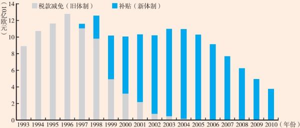 1993-2010年德国私有住房补贴支出(单位:10亿欧元)