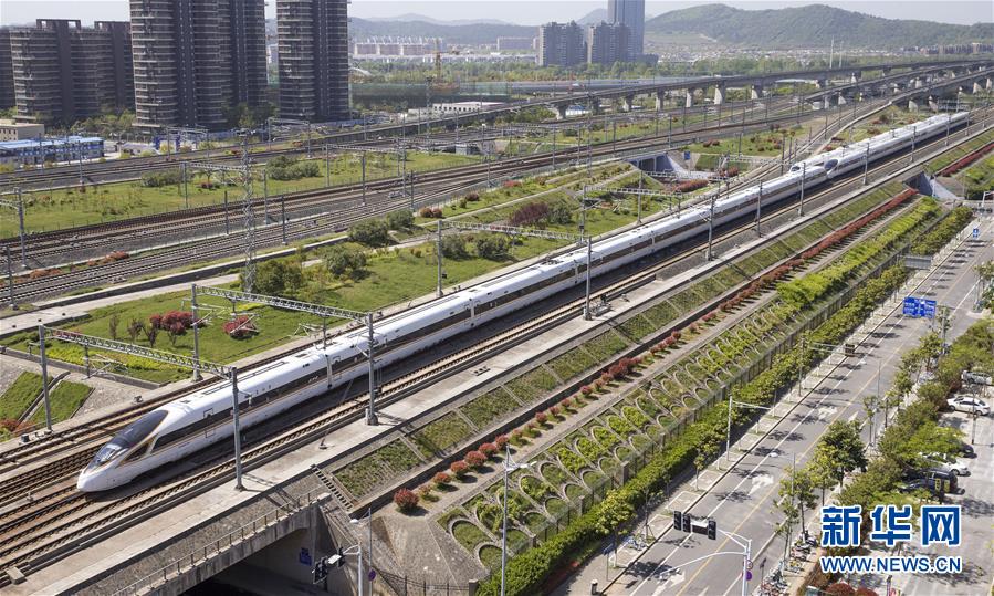 4月9日,一列“复兴号”动车组列车行驶在京沪高铁南京市境内。 新华社发(苏阳 摄)