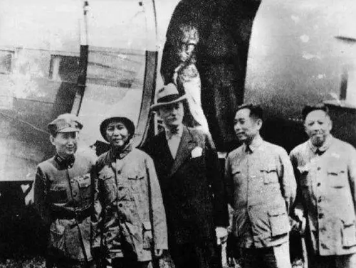 1945年8月28日,毛泽东赴重庆前在延安机场留影