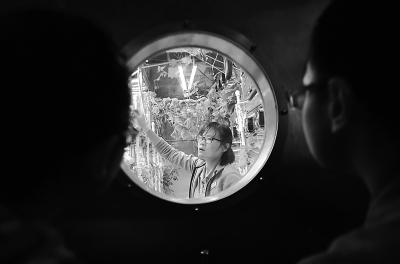 北京航空航天大学“月宫一号”科普基地举行公众开放日活动,两名观众通过舷窗观察“月宫一号”实验舱内的科研人员工作。 本报记者 和冠欣摄
