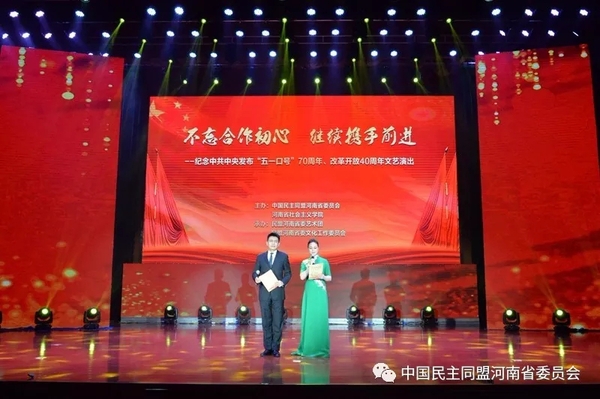 2018年4月19日晚,由民盟河南省委、河南省社会主义学院主办,民盟河南省委艺术团、民盟河南省委文化工作委员会承办的“不忘合作初心继续携手前进——纪念五一口号发布70周年、改革开放40周年”文艺演出在河南省社会主义学院会议中心大礼堂举行。