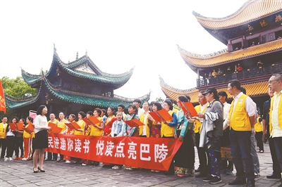 4月23日是第23个世界读书日。民进湖南岳阳市委会举办“民进邀你读书 悦读点亮巴陵”主题活动,在全市设十个点,依次开展经典诵读。图为岳阳楼景区分会场,邀请了岳阳市一中西藏班的藏族学生参加,孩子们在岳阳楼前诵读《岳阳楼记》,引起游客驻足聆听并在倡议书上签名留念,共同呼吁大家做全民阅读的倡导者、推广者。葛伟武 摄影报道