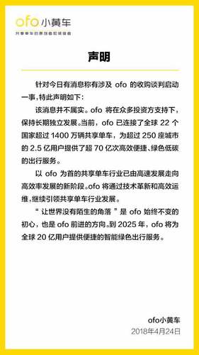 针对今日有消息称有涉及ofo的收购谈判启动一事,特此声明如下: