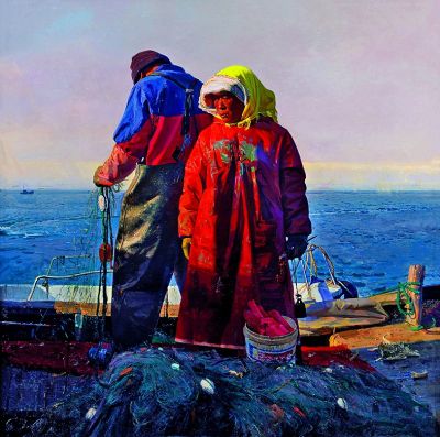 青年画家田野创作的工笔重彩《中国红》,表现了工人悬挂在高空中进行粉刷作业的场景,挥舞的刷子左右摇摆,游刃有余,显示出劳动者娴熟的技术。主体人物浓重的黑色配合背景的矿物朱砂色,强烈的黑白红对比关系给人以震撼的视觉效果。田野说,当时他看到粉刷建筑外墙的工人,身上的衣服被飞溅的油漆染成画面般的效果,工人们认真的劳动精神打动了他,勾起了其强烈的创作激情,他通过速写、草图、图片等综合方式收集了大量素材,最终创作出了这样一幅具有时代特色的重彩作品,体现了新时代劳动人民的生产热情。王海滨、王瑛合作绘制的工笔画《桑葚》,表现的是维吾尔族妇女的劳动场面?;医饕宋锇才旁诨平鸱指钕吒浇?,与底部的木桌呈现出三角形态势,偏仰视的角度体现了劳动人民的崇高。为了突出画面光感,画家主动将人物处理成厚重、深沉的逆光效果,背景运用了浓重的蛤粉,将人物以及道具的外部轮廓完整地衬托出来。由于逆光具有平面性特点,这进一步提供了造型语言与中国画平面性审美特征的视觉因素,强烈的明暗对比既体现了新疆地区的光照特征,同时又象征了劳动人民光明美好的内心世界。赵健创作的油画作品《故乡》则使用了“纪念碑式”经典构图,画面主体是一对劳动中的渔民,夫妻相背而立,犹如“英雄”一般伫立在渔船上,画家通过艺术加工赋予了作品含蓄的诗性。
