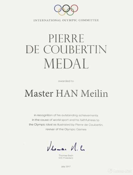 2018年4月24日,瑞士洛桑国际奥委会总部,奥委会主席托马斯·巴赫给中国艺术家韩美林颁发“顾拜旦奖”。这是韩美林2015年在中国美术界第一位获颁联合国教科文组织“和平艺术家”称号之后,再次成为中国美术界获得“顾旦拜奖”殊荣的第一人。