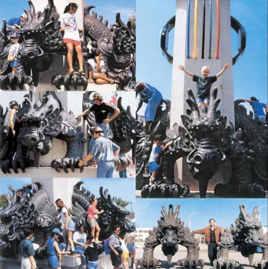 韩美林设计的美国亚特兰大第26届奥运会雕塑《五龙钟塔》,高9.6米,青铜、花岗岩铸造。