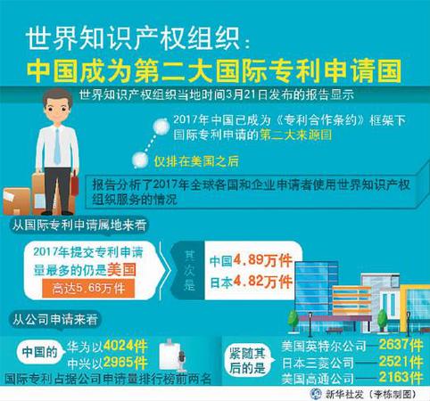 据介绍,2017年,中国发明专利申请量达到138.2万件,连续7年居世界首位;中国通过《专利合作条约》(PCT)途径提交的国际专利申请受理量达到5.1万件,排名跃居全球第二。在世界知识产权组织公布的2017年全球国际专利申请排名中,中国有3家企业成功入围前10名:华为居首,中兴第二,京东方排名第七。
