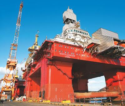 图为中集来福士海洋工程有限公司为国外公司生产的石油钻井平台在码头上组装测试。李明放摄(新华社发)