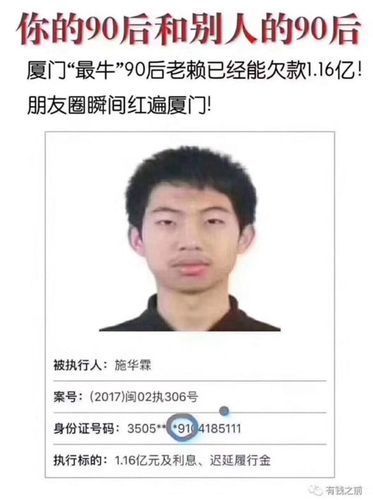 成为老赖之前,施华霖是个年轻的企业家,年仅27岁就已拥有五家公司,注册资本达1500多万元。成为老赖之后,施华霖成了“网红”,有网友调侃他是90后“最?!崩侠?,欠款高达1.4亿元。