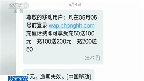 5月4号晚,路女士的手机收到了 显示号码为“10086”发来的这条短信,说凡在5月5号前登陆这个网站充值话费,即可享受充50元送100元,充100元送200元,短信里还附带这个网站链接。
