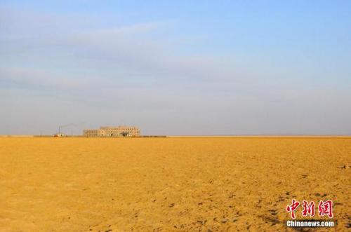 资料图:夕阳中远眺罗布泊镇政府,周边全部是盐碱地。 西海清歌 摄