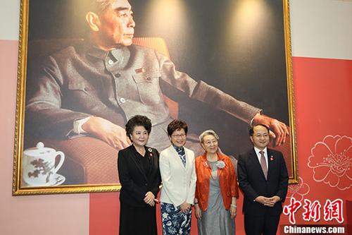 5月8日,香港特别行政区行政长官林郑月娥(左二),中央政府驻港联络办主任王志民(右一),全国政协港澳台侨委员会副主任裘援平(左一),周恩来侄女周秉德(右二)在周恩来照片前合影。当天“人民总理周恩来——纪念周恩来诞辰120周年(香港)大型展览”在香港会展中心举行。中新社记者 谢光磊 摄