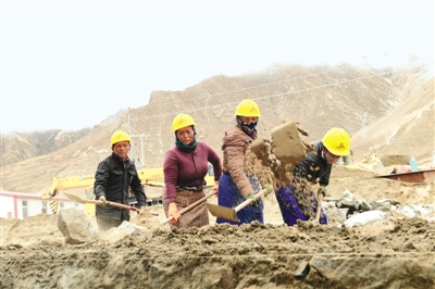 协荣村村民德吉等人在中铁十一局集团桥梁有限公司拉林铁路建设工地挖土砌挡墙。通讯员王荃荃摄