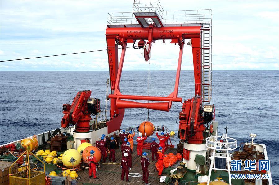 在我国新一代海洋综合科考船“科学”号上,科考队员正在布放潜标(2017年12月10日摄)。新华社记者 张旭东 摄