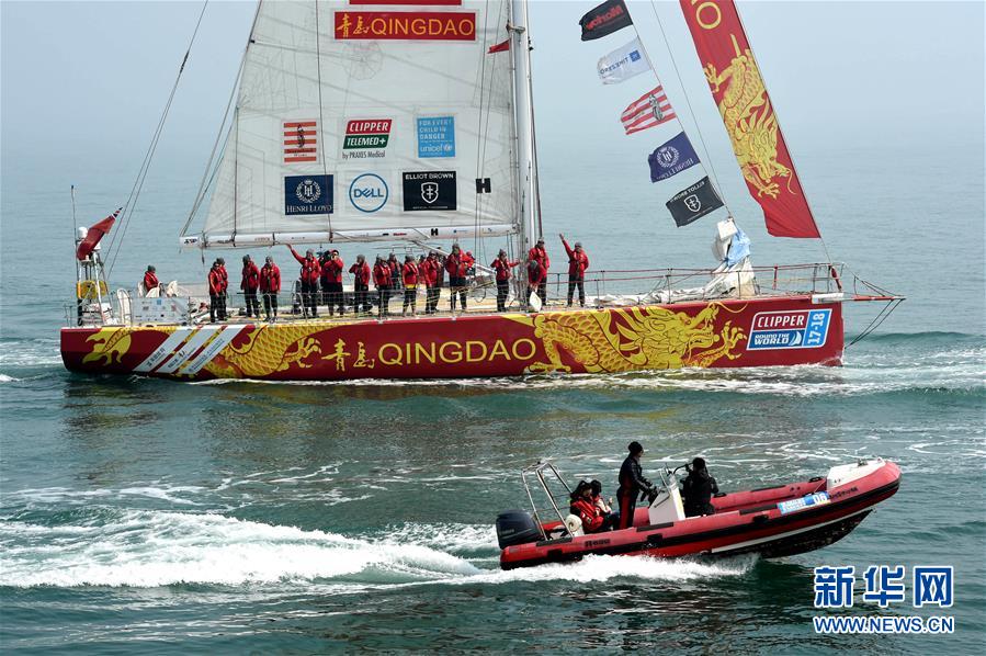 在青岛西海岸新区星光岛码头,参加2017-2018克利伯环球帆船赛的青岛号船员与送行的观众挥手道别(3月23日摄)。新华社记者 李紫恒 摄