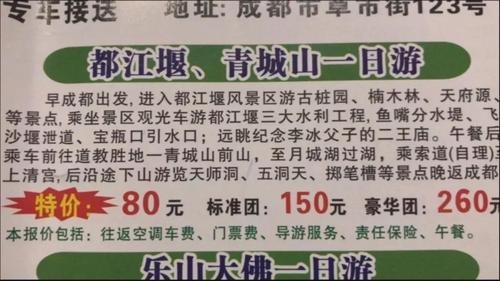 4月底,记者在成都锦里、宽窄巷子、杜甫草堂等景点发现,有许多人正在给来往的游客发放旅游广告。这些旅游广告上都是四川最热门的旅游线路,而且价格诱人,如: