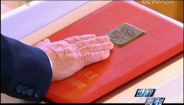 他将右手放在俄罗斯宪法上,庄严宣誓。