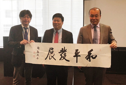 邢凤亮转赠株式会社日本经济新闻社后藤 卓彦先生《和平发展》字画,由中国文学艺术界联合会第十届荣誉委员胡振民题字。