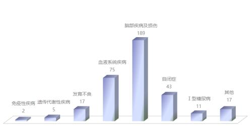据美国纽约血液中心(NYBC)的统计数据表明,脐带血已用于 80 多种疾病的治疗,如重型再生障碍性贫血、β-地中海贫血、白血病、神经母细胞瘤等血液疾??;慢性肉芽肿病、重症联合免疫缺陷病等免疫系统疾病。2017年10月,美国食品药品监督管理局FDA批准杜克大学医学中心扩大性使用脐带血进行神经系统疾病,如自闭症、脑瘫、脑积水等治疗的研究。