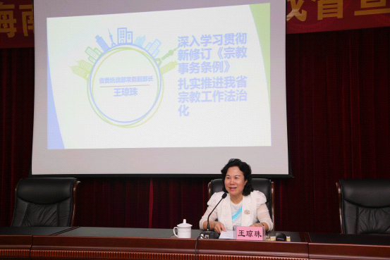 王琼珠以授课的形式为培训班作了动员讲话,并重点对新修订的《宗教事务条例》进行了解读。她要求大家一定要珍惜此次培训机会,认真学习、深刻领会习近平总书记在海南建省办经济特区30周年大会上的讲话精神,结合学习贯彻新修订的《宗教事务条例》,进一步提高服务信教群众和依法办教能力,增强在信教群众中的影响力和号召力,更好的引领广大宗教界人士和信教群众,坚持我国宗教中国化方向,努力维护我省民族团结、宗教和睦、社会和谐的良好社会局面,为海南全面深化改革开放,建设自由贸易试验区、中国特色自由贸易港作出积极贡献。 此次培训班共有学员40名,主要来自我省佛教、道教、基督教、天主教界的代表人士及部分市、县党委统战部的宗教工作干部。培训时间为10天,其中7天在福建华侨大学进行异地教学。