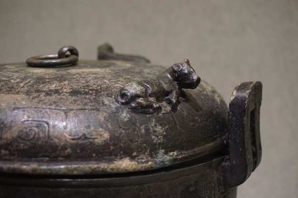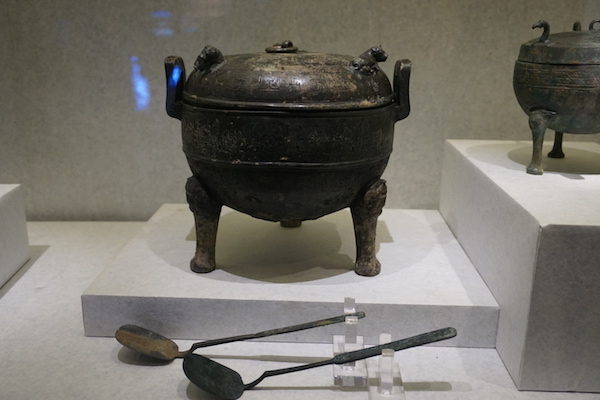 战国三犀铜鼎(1件套有附件2) 鼎圆腹,圜底,附耳微外撇,蹄足,盖微隆,中心一环钮,外围三卧犀。腹部装饰蟠螭纹,口沿外侧有秃棱一周,使口部形同子口。盖饰变形的蟠螭纹。匕,大小、形状和纹饰基本相同。为椭圆形,靠柄处向上翘;直柄,上宽下窄,装饰有兽面纹、勾连云纹。匕与柄合铸一体。
