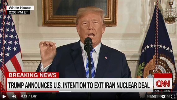 5月8日,特朗普在白宫讲话,宣布退出伊核协议CNN视频截图