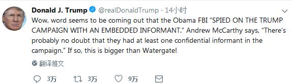 对此,特朗普表示震怒,称“若属实,那就是比水门事件更严重的丑闻”。特朗普17日在推特上连发多条推文,其中一条回应了《国家评论》关于“FBI曾在其竞选团队中安插线人”的报道。他在推文中写道,“哇嗷,有消息传出,奥巴马执政期间,FBI‘安插间谍刺探特朗普竞选团队’。麦卡锡更指出,竞选团队中可能至少有一名‘间谍’。如果消息属实,那就是比‘水门事件’更严重的丑闻”。