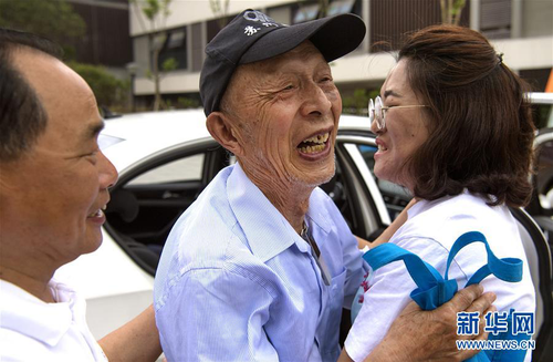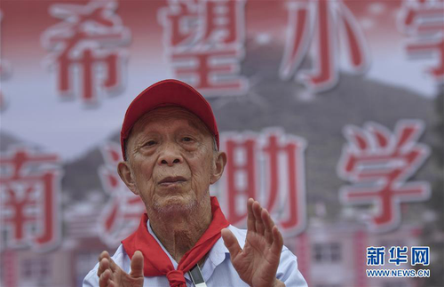 5月19日,周火生老人(前右)与金寨县希望小学的孩子们在一起交谈。当日,80多岁的周火生再次来到大别山腹地的安徽省金寨县南溪镇,开始了他的第100次金寨助学之旅。在革命老区金寨县,周火生是家喻户晓的“希望老人”,更是孩子们敬爱的周爷爷。(来源:新华网 陶明 摄)