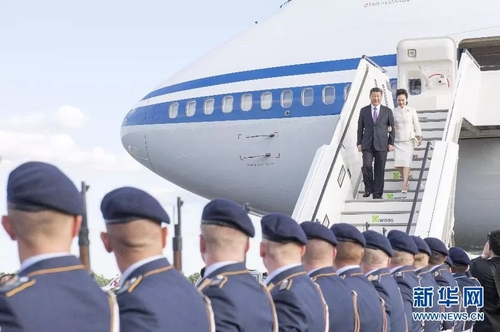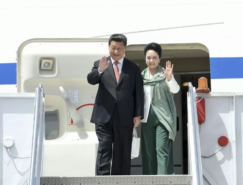△2017年7月4日,国家主席习近平对德意志联邦共和国进行国事访问,习近平和彭丽媛手挽手走下舷梯。