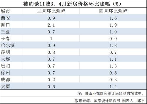 根据国家统计局发布的70城房价数据,被约谈的12个城市中,除佛山外,其余11城的新房价格3、4月份无一例外地出现环比上涨。