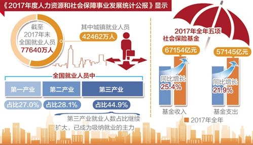 人力资源和社会保障部发布《公报》显示,截至2017年末,我国就业人员超过7.7亿人——