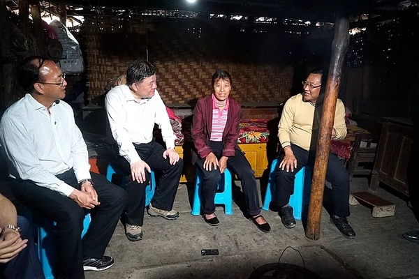 在怒江大峡谷一侧的高山上,金满村就挂在陡峭的山坡上。由于山高坡陡、交通不便,村民经济收入低微,是泸水市典型的贫困村。长期以来,金满村群众分散居住在木棍作柱、篱笆当墙、木板为顶的“千脚楼”里,生活环境十分恶劣。沿着陡峭的山路,调研组徒步来到金满村群众家中,与贫困户倾心交谈,询问他们目前的家庭生产生活状况,孩子上学,脱贫愿望等问题,鼓励他们树立信心、发展产业、增加收入、克服困难。