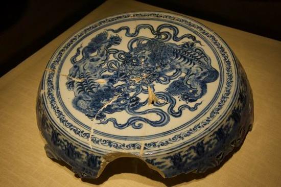 展览中有很多展品使人耳目一新。如:一组青花云龙纹大缸残片,修复后龙缸口径70多厘米,高80多厘米,形体之大,在明代绝无仅有。这种青花云龙纹大龙缸的出土,印证了相关文献记载。永乐十九年(1421年)四月,北京宫殿刚刚落成一年,前朝奉天、华盖、谨身三大殿即遭雷火焚毁。直到19年后的正统五年(1440年)二月才开始重建,于正统六年九月完工。据《明史》记载,当时“命造九龙、九凤膳案诸器,既又造青龙白地花缸。王振以为有璺,遣锦衣指挥杖提督官、敕中官往督更造?!钡笔泵煺庵智嗷ù罅资俏擞美葱钏然?,但因烧造难成,遂改用铜缸、铁缸。